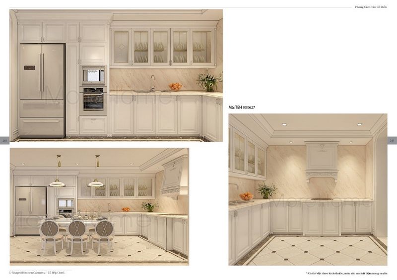 Ý tưởng thiết kế phòng bếp cổ điển màu trắng tinh tế được tối ưu hóa trong từng đường nét từ tủ bếp đến đá lát sàn, đến các kiến trúc sư MoreHome.