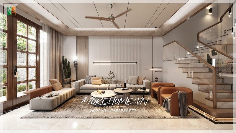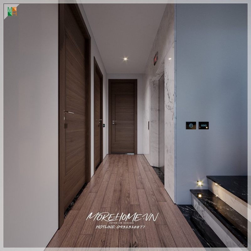 Hành lang đơn giản được thiết kế bằng nhiều vật liệu gỗ với màu nâu trầm chủ đạo, giúp không gian trở nên sang trọng và tạo nên một kết nối lối đi chung giữa các phòng. Điều này cũng tăng cường thẩm mỹ và công năng sử dụng hữu ích của hành lang.