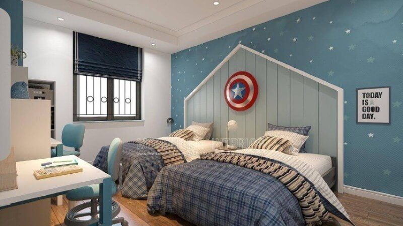 Một hình ảnh nhỏ với khẩu hiệu "Hôm nay là ngày tốt đẹp" trên nền bầu trời đầy sao sẽ làm tăng động lực cho bạn để chào đón một ngày mới với niềm vui thú. Bên cạnh đó, thiết kế nội thất phòng ngủ con trai với cửa sổ kính sẽ giúp con có thể hòa mình vào ánh bình minh mỗi khi thức dậy.